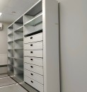 Мы установили передвижные стеллажи серии Т, с нагрузкой на полку до 80 кг и адаптировали их внутреннее содержание под хранимое. Одну секцию стеллажа сделали с оцинкованными полками, для повышения их прочности при ежедневной работе, и выдвижными ящиками с разделителями для мелких деталей. Остальные секции сделали ячеистого формата для адресного хранения.